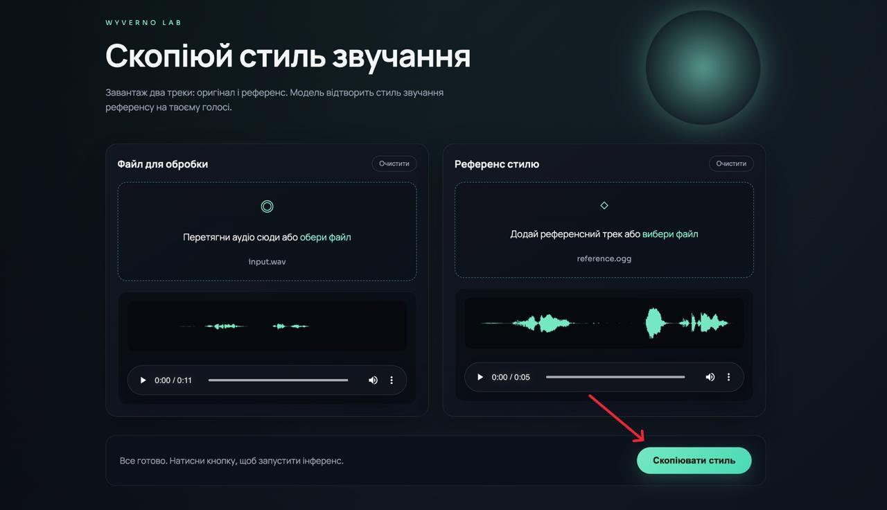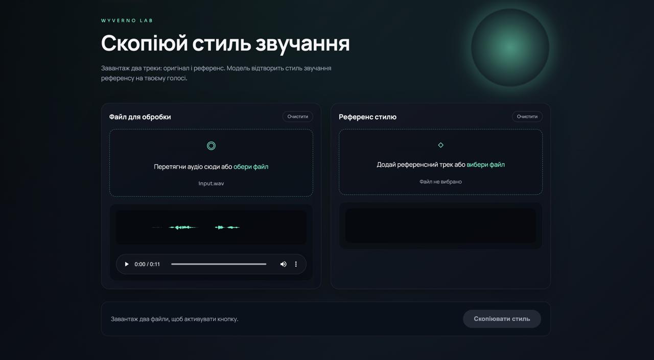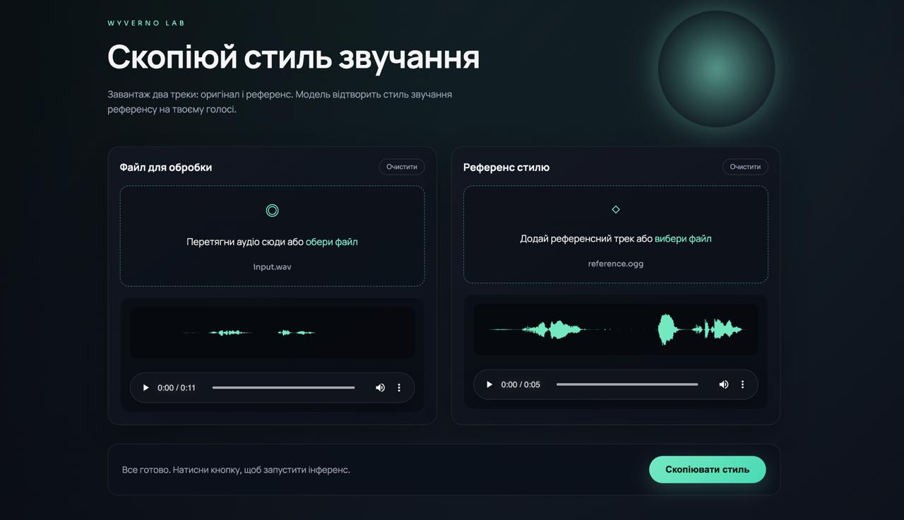 Раді представити бета-версію Wyverno Lab — експериментального сервісу, побудованого на основі сімейства моделей Wyverno, призначених для автоматичного перенесення аудіообробки з одного звукового матеріалу на інший.