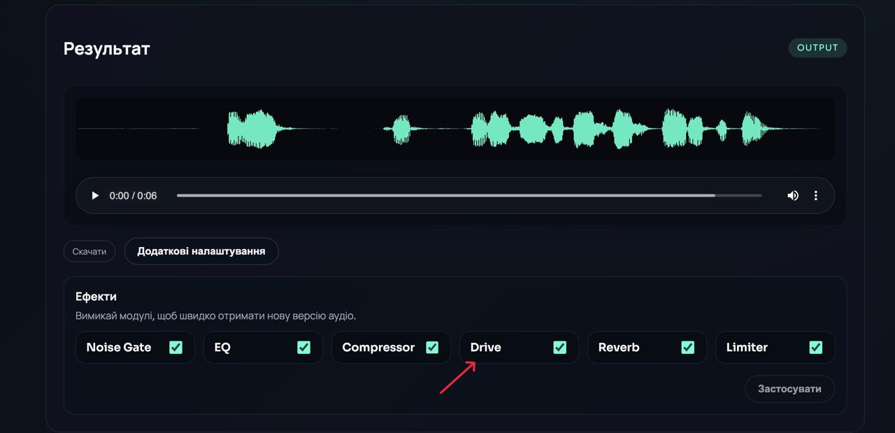 До доступного набору ефектів додано Drive, який розширює можливості тембральної обробки та дозволяє отримувати більш насичене й характерне звучання голосу.